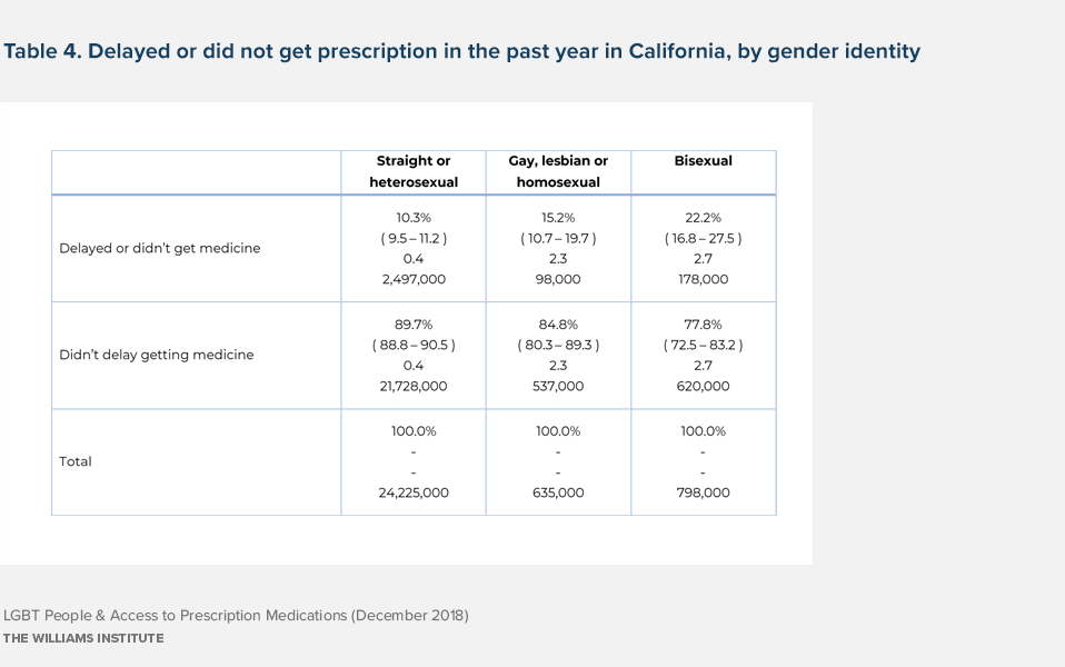Data from the California Health Interview Survey indicate that LGBT people (5.6% of respondents) are more likely to delay getting the prescription medications they need or to go with them entirely. This is particularly true for more vulnerable parts of the LGBT population, including bisexuals, transgender people, lesbians, those with low incomes, and the elderly.